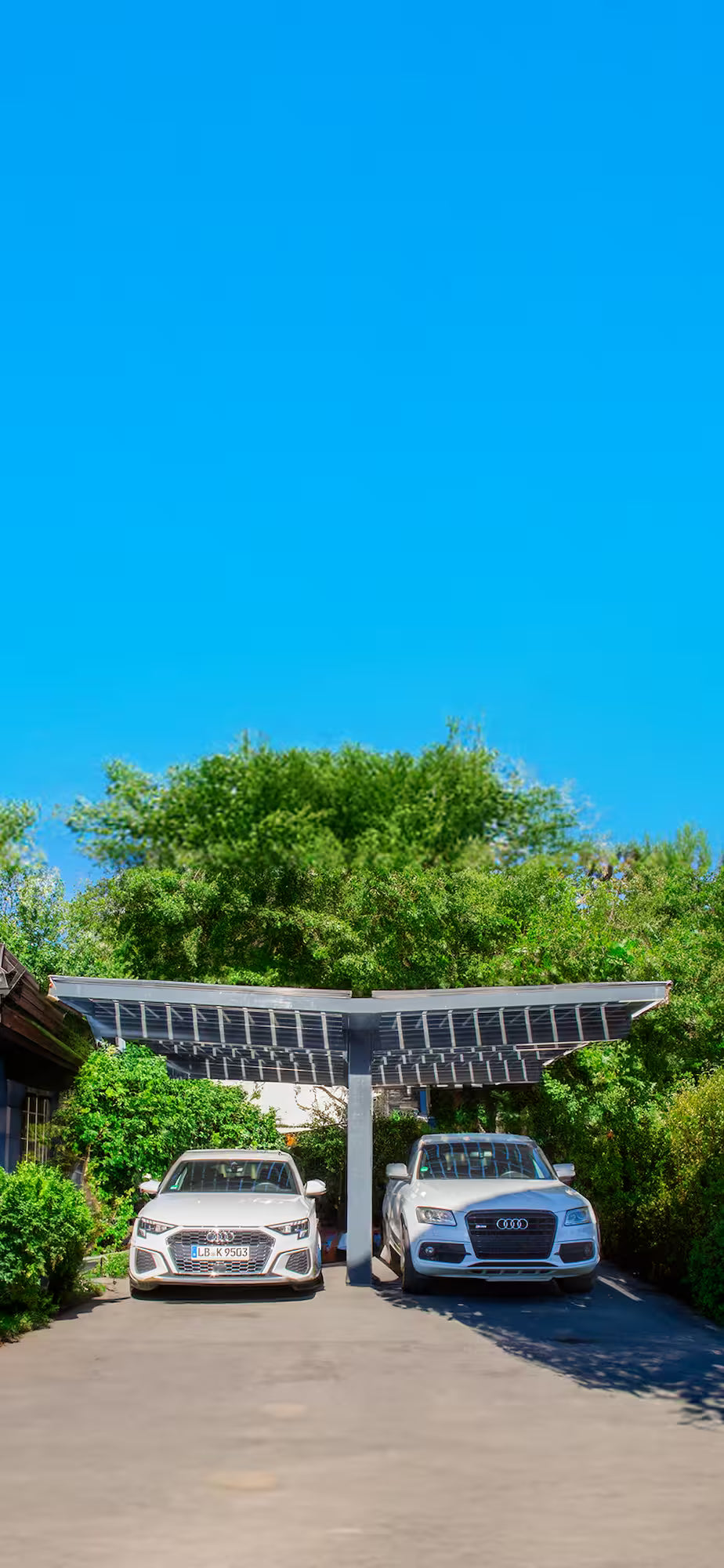 Dadurch entsteht eine angenehme Beschattung für das Fahrzeug, während ausreichend natürliches Licht unter der überdachten Fläche vorhanden ist. Parallel erzeugen die bifazialen Solar-Glaspaneele Strom aus Sonnenenergie.