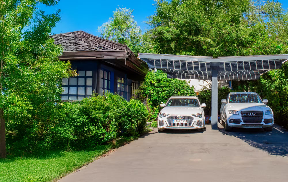Der eCarport von KFI verfügt über eine einzigartige Kragarmkonstruktion, die Schutz und Eleganz vereint. Sie ermöglicht ein komfortables Ein- und Ausparken sowie ein bequemes Ein- und Aussteigen.